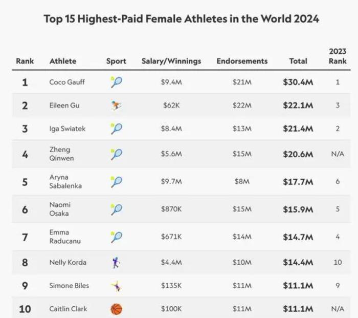 2023年年底,《福布斯》杂志公布全球女运动员收入榜,郑钦文以奖金和赞助收入总计720万美元位列第15位,随后2024年底,《福布斯》杂志继续公布了这份收入榜单,郑钦文的总收入为2060万美元,包括场内奖金收入560万美元、代言收入2200万美元,已经升至世界第4位,仅次于高芙(3440万美元)、斯瓦泰克(2380万美元)、谷爱凌(2210万美元)。这意味着,郑钦文的收入同比增加了超180%。